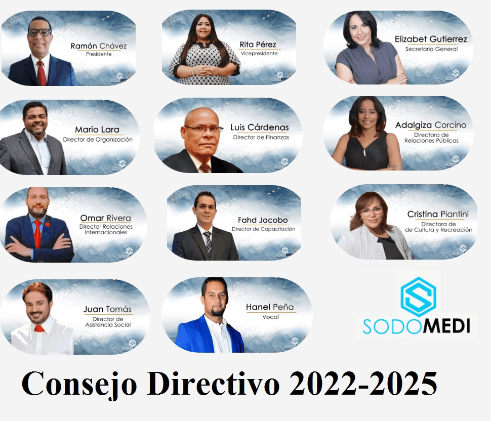 El Consejo Directivo de SODOMEDI está conformado por Ramón Chávez R., presidente; Rita Pérez, vicepresidenta; Elizabet Gutiérrez de Moreno, secretaria general; Mario Lara, director de Organización; Luis Cárdenas, director de Finanzas; Adalgisa Corcino, directora de Relaciones Públicas; Omar Rivera, director de Asuntos Internacionales; Fahd Jacobo Yamani Salado, director de Capacitación; Cristina Piantini, directora de Cultura y Recreación; Juan Tomás, director de Asistencia Social; y Tirso Salvador Peña (Hanel Peña), vocal.
