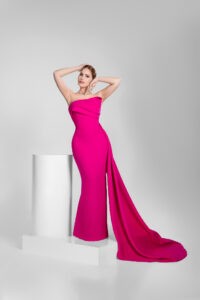 Según Sánchez, “Es un vestido de Crepé 4play de seda, de color rosado fucsia y de estilo columna que impregna esa dulzura y alegría que tanto caracteriza a Jenny, pero también con la sobriedad en cuanto a postura, corte y elegancia como amerita un evento como Premios Soberano”.