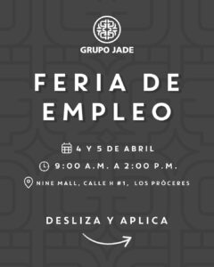 Santo Domingo, República Dominicana. – Grupo Jade anuncia su segunda feria de empleo, la cual se llevará a cabo los días 4 y 5 de abril en el primer nivel de la plaza comercial Nine Mall, situada en la calle H, no.1, Los Próceres, cerca de la parada del km 9 de la autopista Duarte.