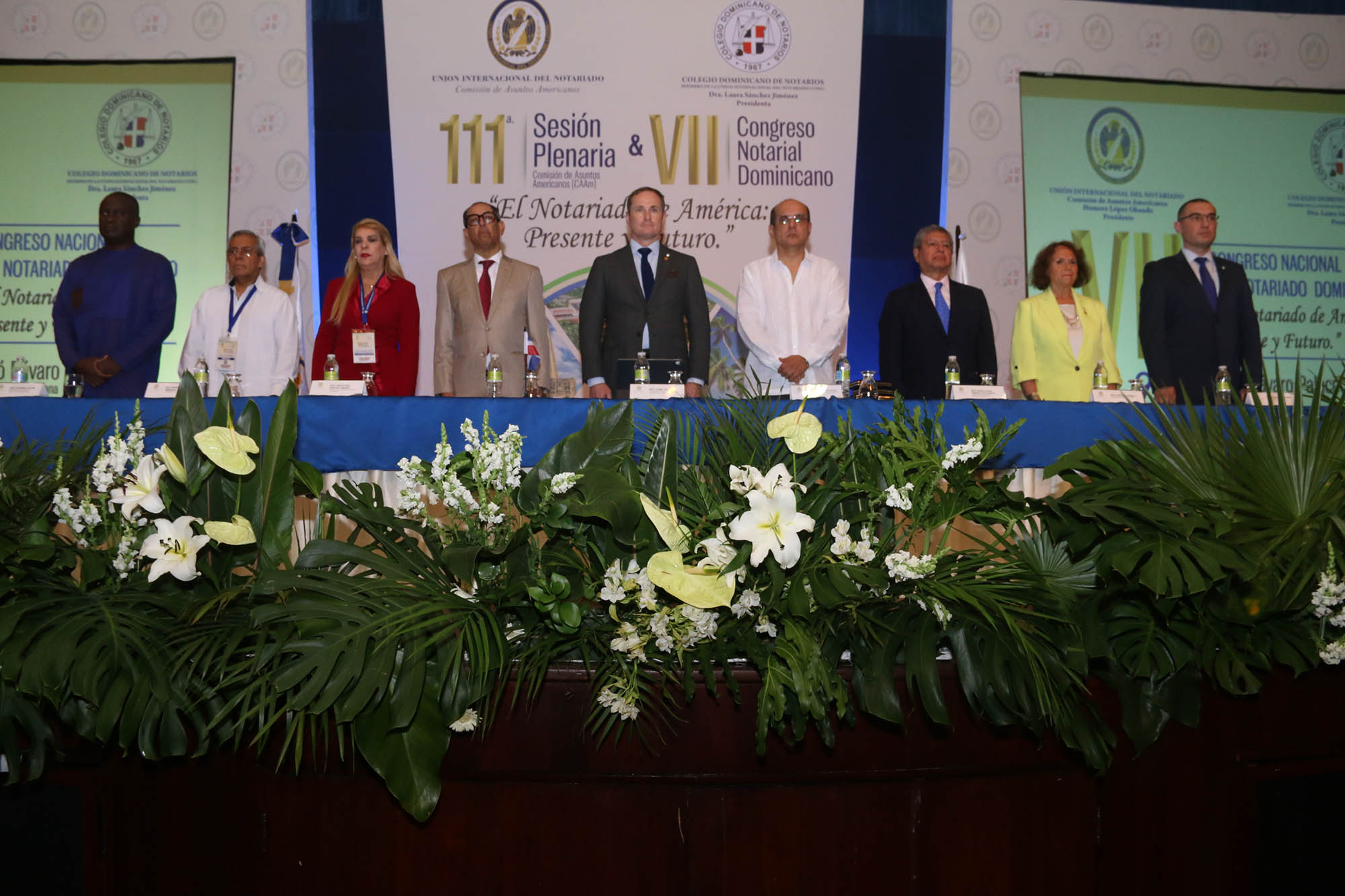 La mesa de honor de la inauguración estuvo integrada por Olagnika Salam, presidente de la Comisión de Asuntos Africanos (CAAF); David Figueroa Márquez, presidente honorífico de la Comisión de Asuntos Americanos (CAAm); Laura Sánchez Jiménez, presidenta del Colegio Dominicano de Notarios; Ramón Herrera Carbucia, vicepresidente de la Suprema Corte de Justicia; Lionel Galliez, presidente de la Unión Internacional del Notariado (UINL); Homero López Obando, presidente de la Comisión de Asuntos Americanos (CAAm); Mario César Romero, presidente del Colegios de Notarios del Perú; Cristina Noemí Carmella, presidenta honoraría de la Unión Internacional del Notariado, y Dilshod Ashurov, de la Comisión de Asuntos Asiáticos (CAAS).