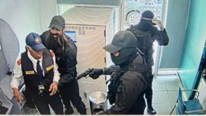 Luego del asalto al Banco Popular, circulan en las redes sociales el m fotos del momento en l que los ladrones penetran al lugar y apuntan con un arma al guardia de seguridad.