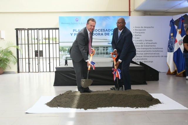 El rector de la Universidad Autónoma de Santo Domingo (UASD), maestro Editrudis Beltrán Crisóstomo, y el ministro de Industria, Comercio y MIPYMES, licenciado Víctor Bisonó Aza, dejaron iniciado este jueves los trabajos de construcción de una planta purificadora y envasadora de agua universitaria durante un acto celebrado en el comedor de la academia estatal.