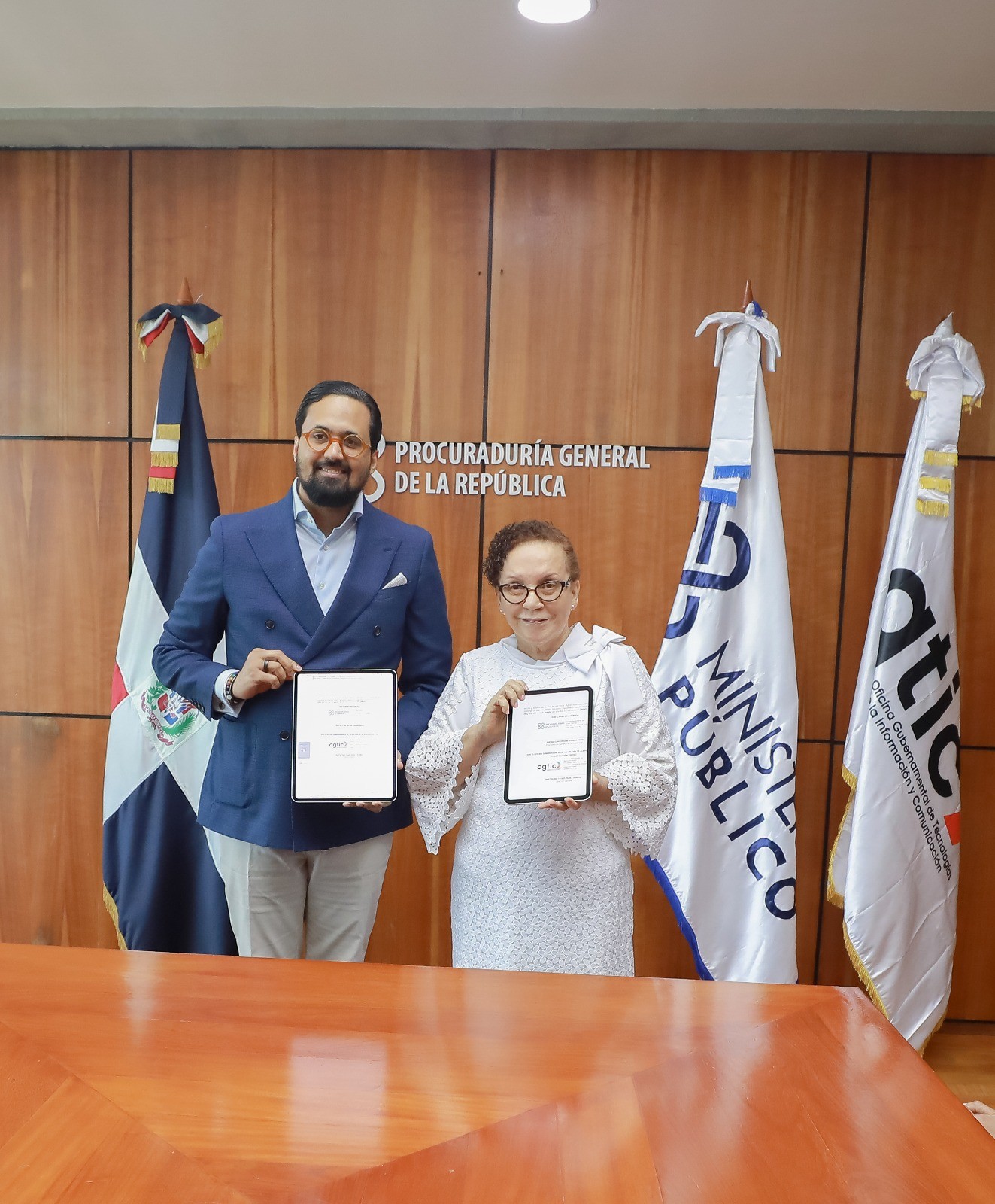 Santo Domingo.- Con el objetivo de eficientizar las acciones del Ministerio Público y mejorar la calidad en el servicio, la titular de la Procuraduría General de la República, Miriam Germán Brito y el director general de la Oficina Gubernamental de Tecnologías de la Información y la Comunicación (OGTIC), Bartolomé Pujals, firmaron un acuerdo interinstitucional para la implementación de la firma digital.