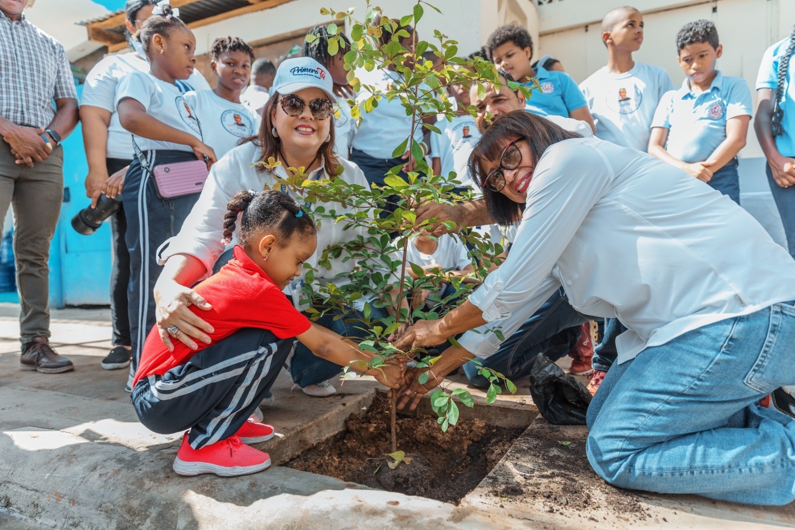 Santo Domingo, D.N.– En colaboración con la Dirección General de Proyectos Estratégicos y Especiales de la Presidencia (Propeep), la Alcaldía del Distrito Nacional plantó árboles en las remozadas aceras de la calle 42 de Capotillo junto a estudiantes del sector.