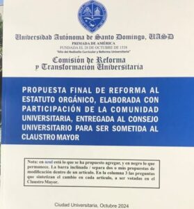 Santo Domingo, R.D. El rector de la Universidad Autónoma de Santo Domingo (UASD), maestro Editrudis Beltrán Crisóstomo, recibió de manos del presidente de la Comisión de Reforma y Transformación Universitaria, maestro Faustino Collado, la Propuesta Final de Reforma al Estatuto Orgánico, durante un acto celebrado en el salón del Consejo Universitario.