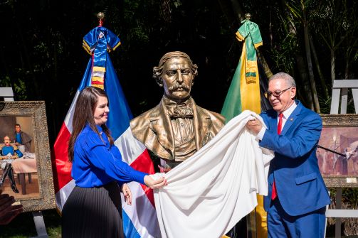El acto patriótico prosiguió con las palabras de la embajadora Angie Martínez y el presidente del Instituto Duartiano, Wilson Gómez Ramírez, quienes encabezaron el depósito de una ofrenda floral ante el busto de Duarte y estuvieron a cargo de develar esta escultura en honor al fundador de la República Dominicana.