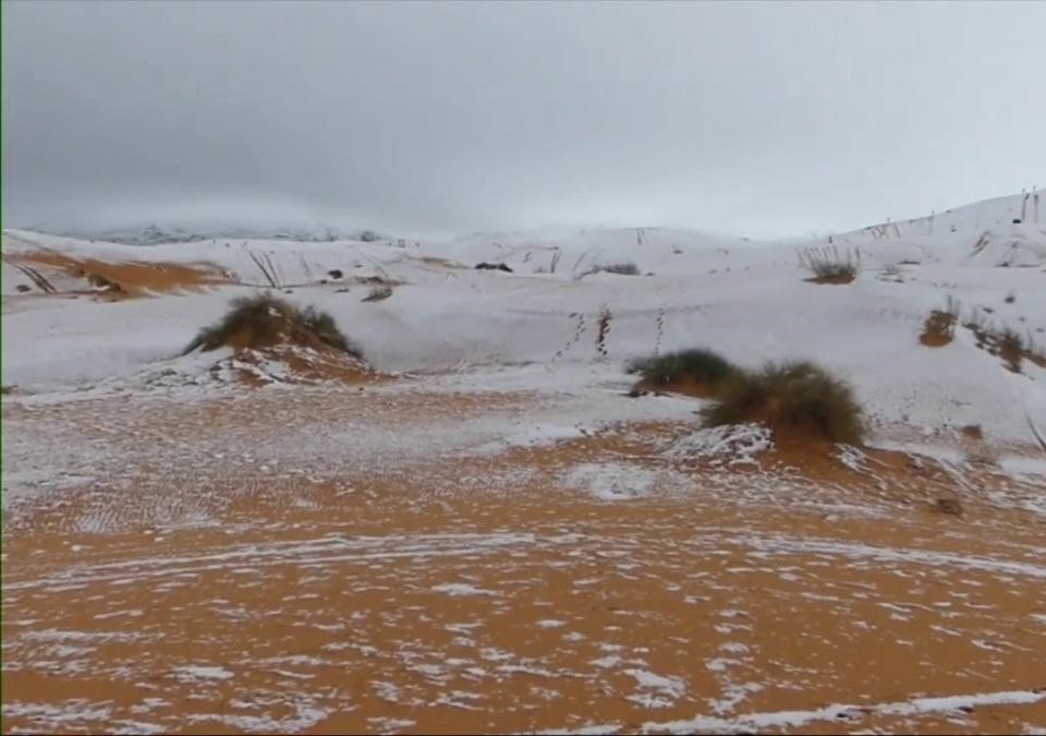 El fotógrafo argelino Karim Bouchetata capturó un video de nieve cayendo sobre partes del Desierto del Sahara el día de Año Nuevo.