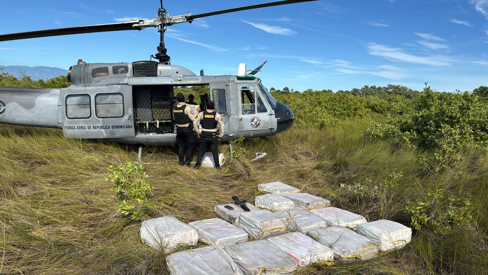 Posteriormente se inició una amplia operación de búsqueda y rastreo con helicópteros de la Fuerza Aérea, equipos de reacción de la DNCD, la Armada y del Ejército, logrando arrestar a seis hombres (cuatro dominicanos y dos haitianos) y ubicar entre unos matorrales 26 sacos, conteniendo en su interior los 766 paquetes de la presunta droga.