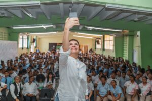 Santo Domingo, D.N.- Carolina Mejía llevó a estudiantes del Instituto Politécnico Profesor Víctor Rafael Estrella Liz, conocido como “La Perito”, un conversatorio sobre el funcionamiento de la Alcaldía del Distrito Nacional, donde aprovechó para promover entre los jóvenes la buena conducta ciudadana.