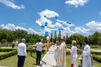 La misa fue cantada por las voces del coro de la maestra Elsa Paulino y luego de la eucaristía se elevó al cielo un gran Rosario hecho con globos biodegradables, mientras el coro cantaba el Ave Maria de Schubert.