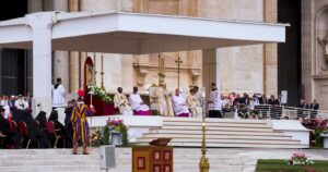 La vicemandataria estuvo junto con otras autoridades de las más de 150 delegaciones presentes y miles de feligreses de la fe católica durante la ceremonia, iniciada a las 10 de la mañana (hora del Vaticano) en la Plaza de San Pedro.
