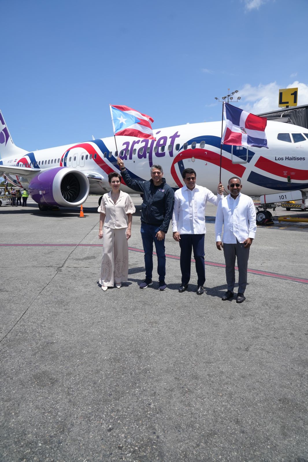 El vuelo fue despedido por Collado y encabezado por el CEO y fundador de Arajet, Víctor Pacheco, quienes mostraron las banderas dominicana y puertorriqueña como señal de conquista de un destino más en la amplia red de destinos que ha estado construyendo Arajet en el continente, los cuales suman ya 28.