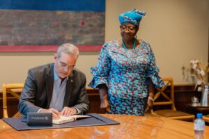 Durante un encuentro sostenido por la funcionaria con el presidente Luis Abinader, quien la visitó en la sede del organismo, la doctora Ngozi Okonjo-Iweala, felicitó al mandatario por los avances que va teniendo la República Dominicana, tanto en negocio electrónico, como en la preservación del medio ambiente.