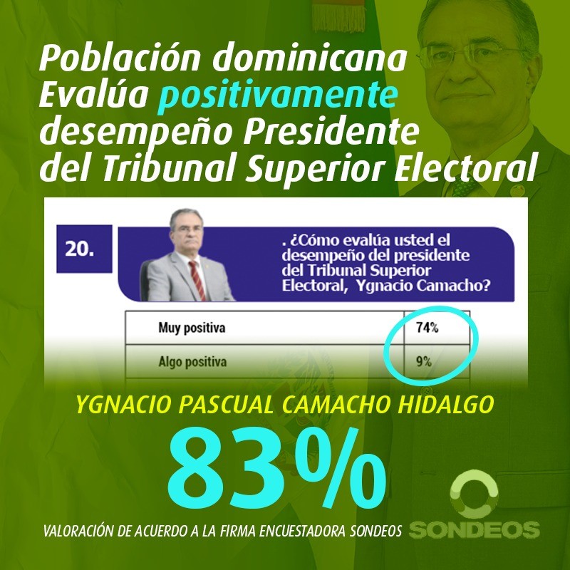 Santo Domingo, D.N.– Más del 80 % de los ciudadanos consultados en la más reciente encuesta de la firma SONDEOS evalúa como positivo el desempeño del magistrado Ygnacio Pascual Camacho Hidalgo como presidente del Tribunal Superior Electoral (TSE).