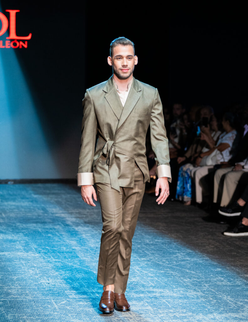 Con 25 creaciones exclusivas, la propuesta exploró una paleta de verdes, beige y marrón que evocaba la naturaleza y la calidez de la región. Las texturas y líneas cuidadosamente trabajadas generaron un diálogo visual que combinaba elegancia con autenticidad tropical. Cada pieza fue también un homenaje a Fausto Miranda, mentor y sastre de De León, cuya influencia marcó profundamente esta colección.