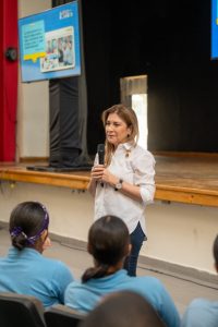 Santo Domingo, D.N.- Carolina Mejía sostuvo una conversación con los estudiantes del Instituto de Señoritas Salomé Ureña, mediante el programa La Alcaldía llega a los Centros Educativos, donde destacó la importancia de la recuperación de los espacios públicos y el cuidado del medio ambiente.