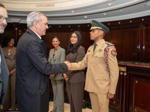 Al presidente le acompañan el ministro de la Presidencia, José Ignacio Paliza; el de Relaciones Exteriores, Roberto Álvarez, y el de Educación, Luis Miguel De Camps; también la directora de Ética e Integridad Gubernamental, Milagros Ortiz Bosch; su hija Esther Abinader; el jefe del Cuerpo de Seguridad Presidencial, Jimmy Arias, y sus asistentes Eilyn Beltrán y Noelia Shephard.
